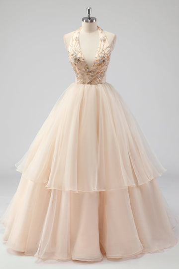 En formell kjole med champagnehalter med perler i linje