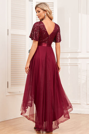 Burgunder A-linje V hals korte ermer høy lav prom kjole