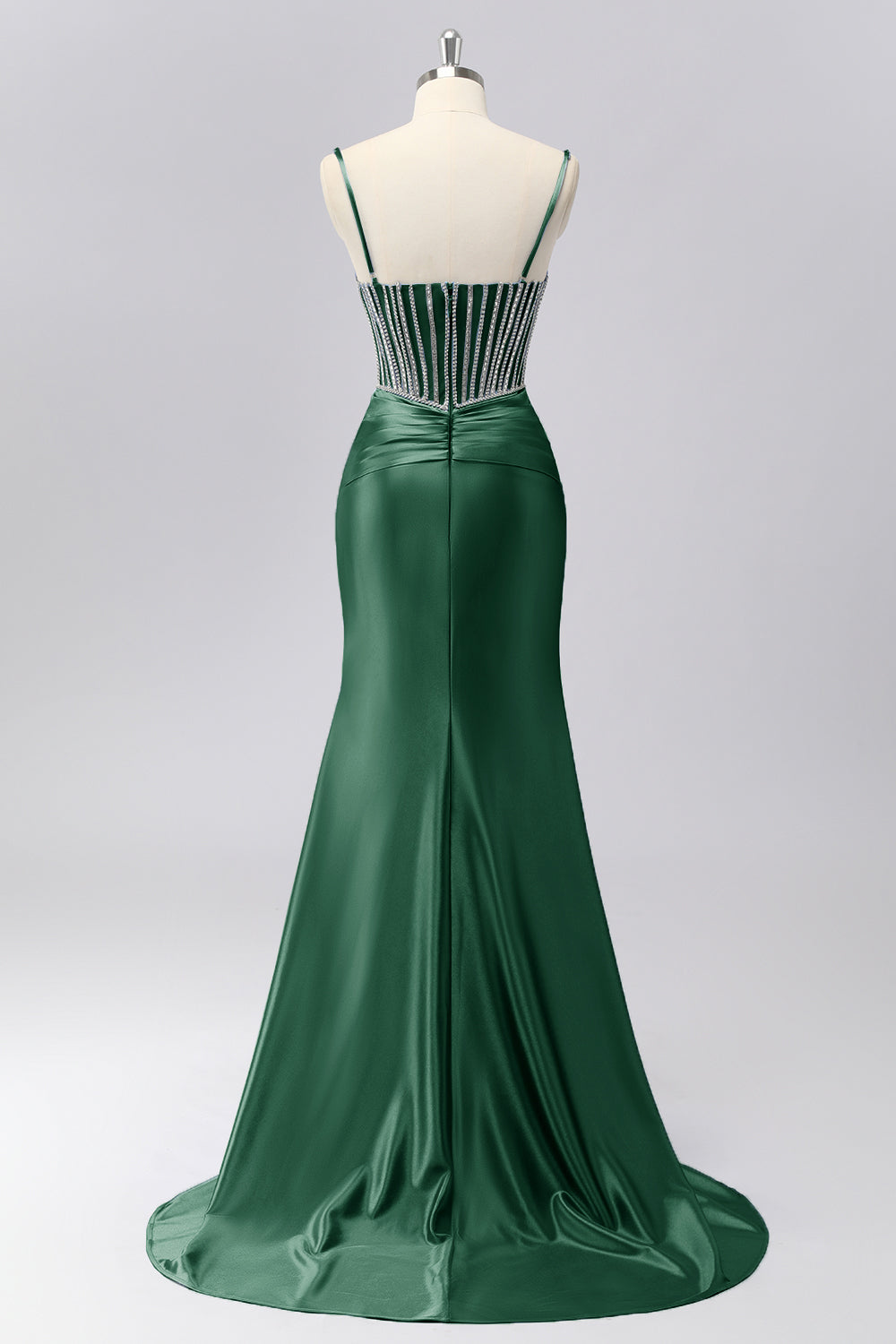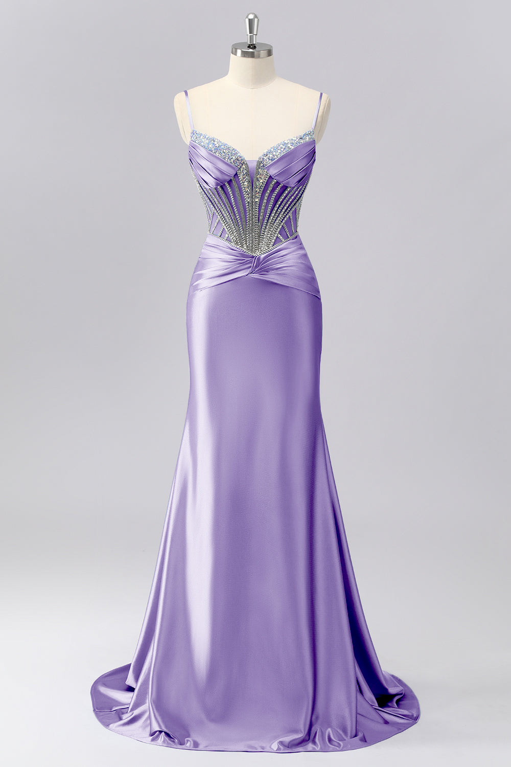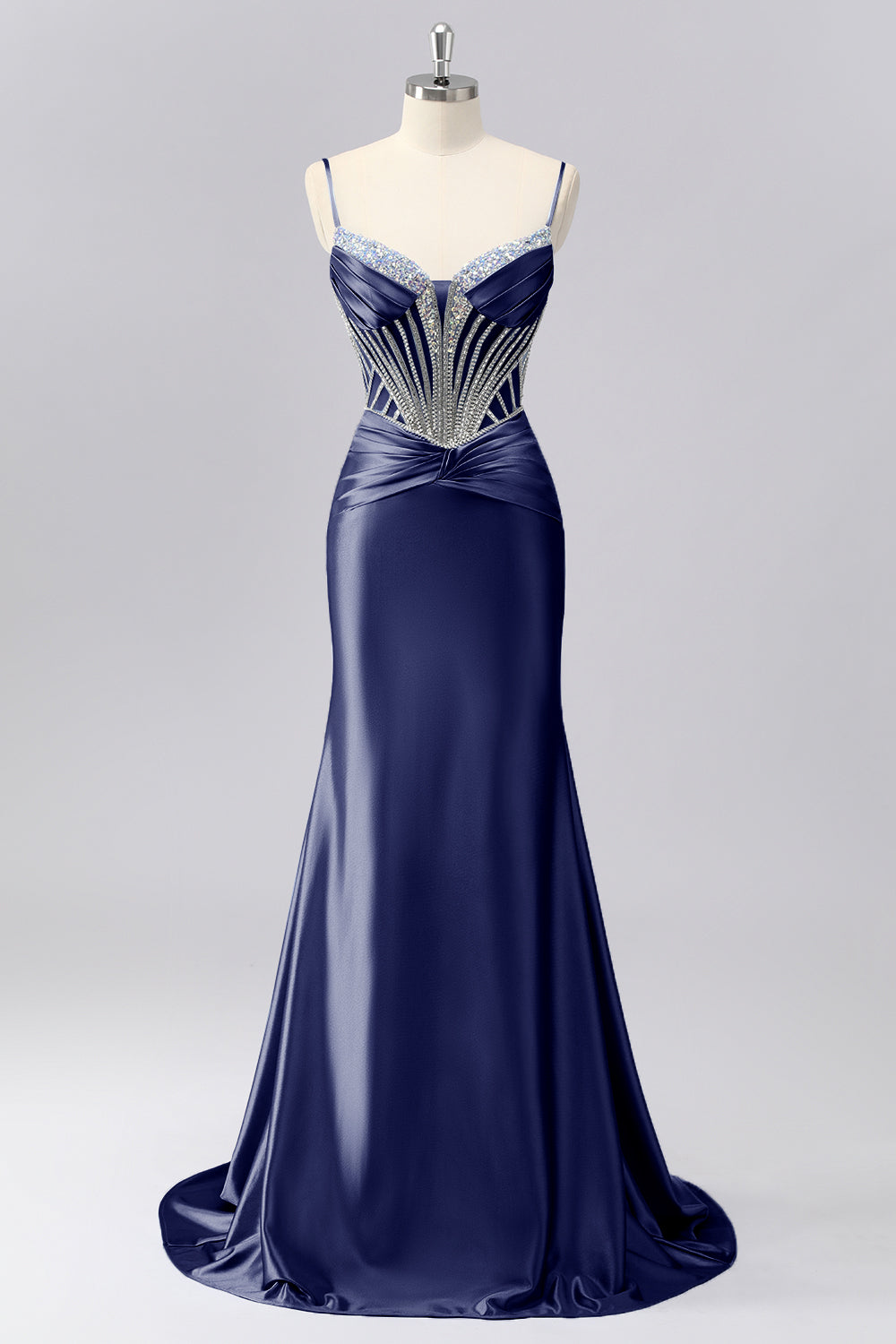 Glitrende gråblå havfruekorsett med rynker, satin, lang ballkjole med rhinsteiner