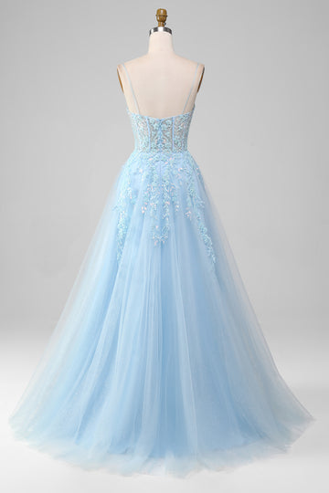 Lyseblå Spaghetti Stropper A-linje Tyll Lagdelt Lang Korsett Ballkjole Med Splitt