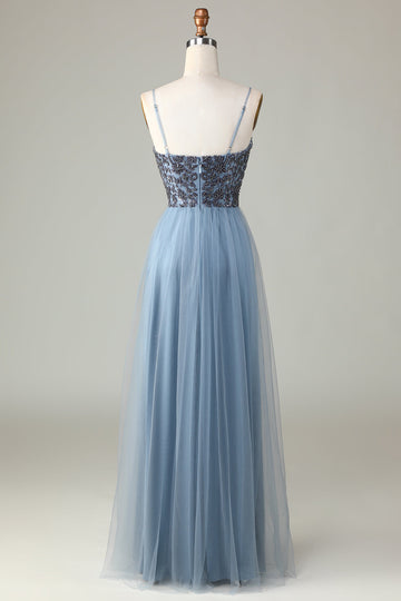 Støvete Blå A Line Korsett Lang Brudepikekjole med Splitt