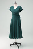 Mørkegrønn A-linje kjole til brudens mor med korte ermer