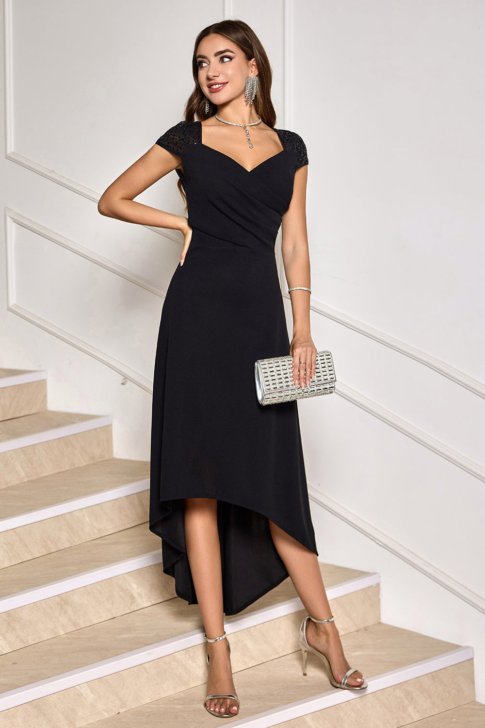 Svart V-hals High-Low Cocktail Kjole med Cap Ermer