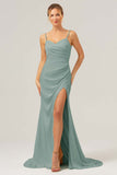 Elfenben Slire Spaghetti Stropper Rynket Lang Sateng Brudepike Kjole Med Splitt