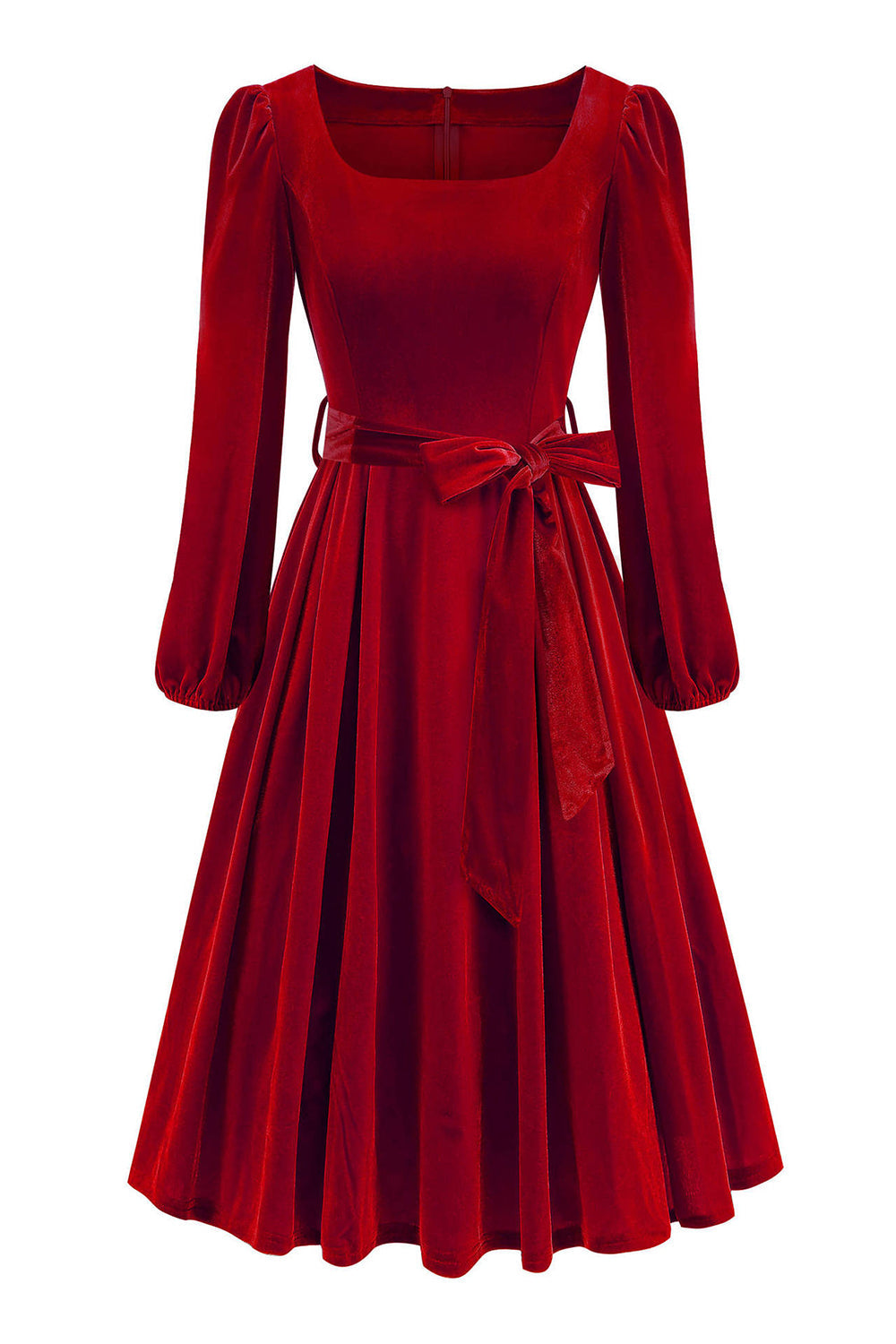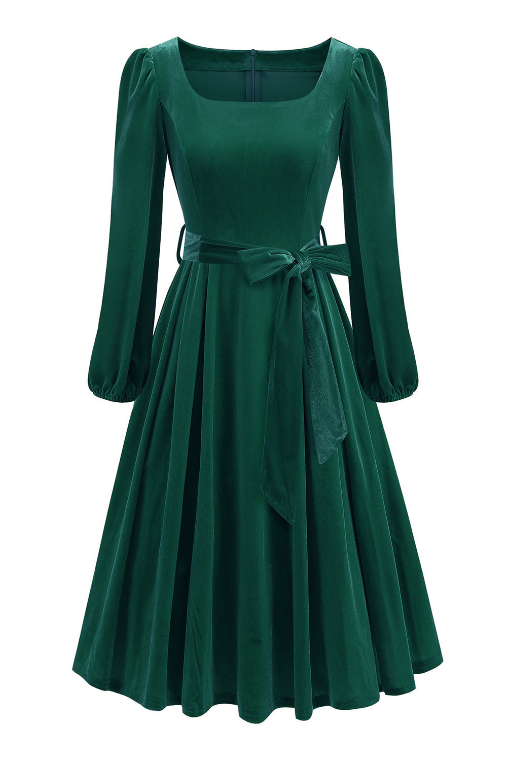 Mørkegrønn langermet A-linje kjole fra 1950-tallet med belte